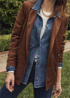 Texture! Tactile materials and finishes are big this Fall. Think suede (more on that next), leather, corduroy, herringbone, shearling, crochet, boucle (a wooly, nubby fabric), satin and more. Experiment with different textures to create visual interest in your outfit. A textured scarf or other accessory can also add some oomph or you can layer different fabrics to reflect your own personal style. Finally, since dark florals in dresses and blouses are still popular, layering a boho dress with a textured jacket could be both fun and functional!